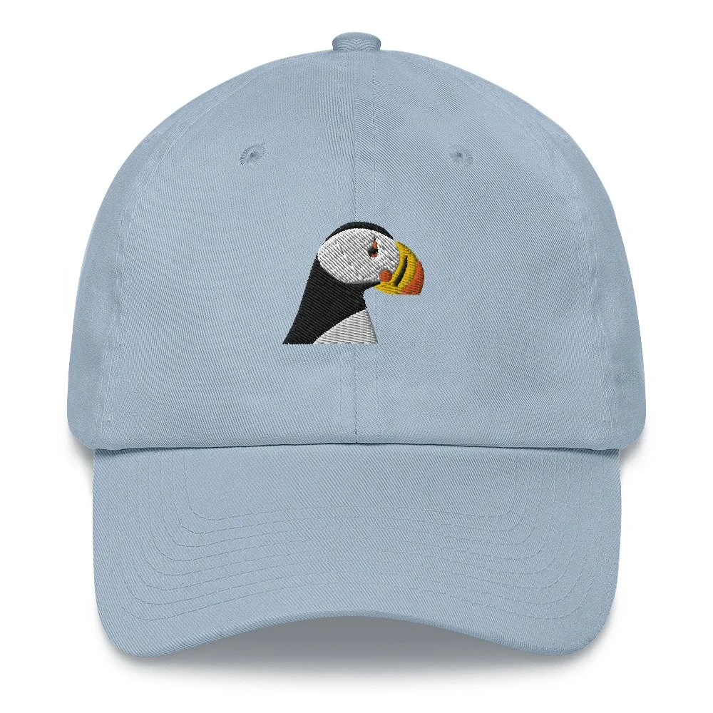 Broderie d’un macareux sur une casquette classique. Elle a une visière incurvée et une sangle à boucle ajustable. Illustré par Martha, cette collection a été inspirée de notre voyage dans les provinces atlantiques.